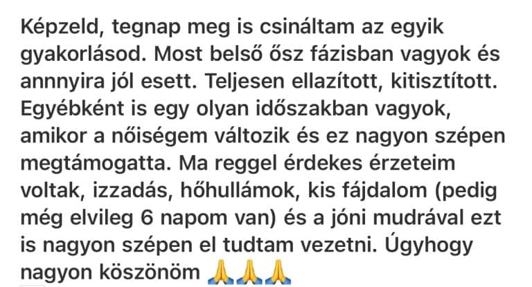 Igen, a kurzus segít, hogy visszakapcsolódj a női áramláshoz. Minden ciklusszakasz gyakorlását hozzákötöttem a holdfázisokhoz, így aszerint is gyakorolhatsz. De meg fogod érezni egy idő után minden gyakorlás hangulatát, és nyugodtan válaszd majd ki kedved szerint, amelyikre épp szükséged van.