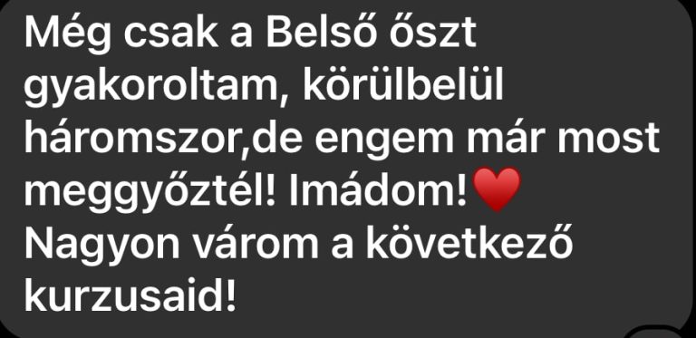 Abszolút rád bízom! A kurzus célja, hogy felfedezd a határaid, szükségleteid és a gyakorlatok feltöltődésként, női rituálékként kísérjenek az utadon, ne pedig egy újabb terhes teendőt jelentsenek. Már heti egy gyakorlástól is érezni fogod a változást: kiegyensúlyozottabb és nyugodtabb leszel. De gyakorolj bátran heti többször is, ahogy Neked és a testednek a legjobb.